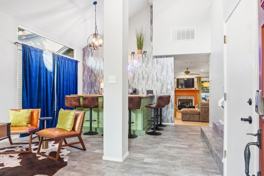 This stylish home features a fully stocked chef’s kitchen with high-end appliances, a large refrigerator, ample cabinetry, a large island with high seating, and a drip and Keurig coffee maker. The living room includes a smart TV, a large and plush sectional sofa, and accent chairs. For entertainment, there's a game room with an indoor bar, pool table, darts, and arcade machines. Enjoy outdoor amenities such as a heated pool with a built-in hot tub, a fire pit, an outdoor bar, a grill, and games like cornhole, giant connect 4, and a putting green.