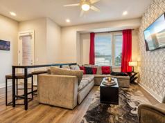 This four-bedroom townhome brings the energy of Las Vegas to Music City and is perfect for groups, families, and friends. The spacious rooftop deck has plush seating, a fire pit, outdoor dining, a TV, and city views. The living area is made for movie nights and easy gatherings. Let loose in the casino-themed game room where you can deal poker hands, play shuffleboard, and mix drinks at the bar. Each bedroom is custom designed after a famous Vegas hotel, including Caesars Palace, Flamingo, Luxor, and Bellagio. The chef’s kitchen features high-end appliances and a breakfast bar. A full-size washer and dryer are available for easy cleanups. Fast Wi-Fi and smart TVs are available throughout. Keyless smart lock entry is provided.