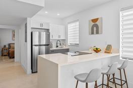 This home features fully furnished interiors, a modern kitchen, and high-speed Wi-Fi. The open living area includes a plush sofa, accent chair, and Smart TV. The kitchen features stainless steel appliances and a breakfast bar. A shared ground-floor laundry room and central air conditioning are also available.