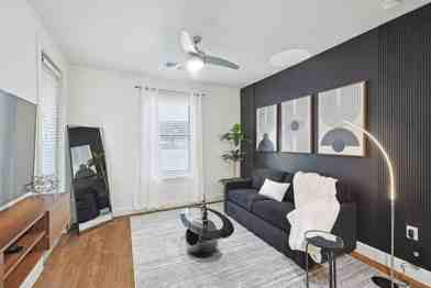 The apartment features brand-new, high-end furnishings and upscale decor, including granite countertops, a kitchen island, and stainless steel appliances. The fully equipped kitchen includes complimentary coffee and tea. Enjoy the 50" smart TV with live cable and Netflix, in-unit laundry, complete temperature control, a coffee maker, an electric kettle, and a microwave. The apartment also features luxurious memory foam beds with premium bedding.