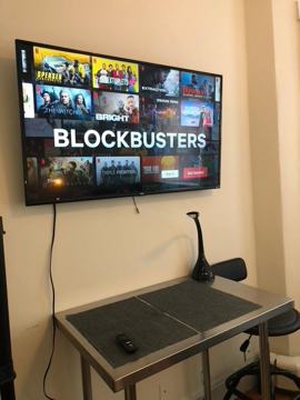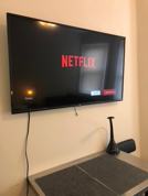 This apartment is fully equipped and features air conditioning. The inviting living area includes a plush sofa and a sleek television. The completely equipped kitchen features modern appliances. The serene bedrooms are provided with fresh linens for peaceful nights. A functional workspace is available with a desk. The spacious bathroom is adorned with vibrant shower curtains.
