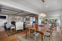 This home features a bright living area with floor-to-ceiling bay views, a large dining area opening to the lawn and water, and an open kitchen with an oversized island, butcher block top, brass fixtures, and bay views. The primary bedroom has a king-size bed and an en-suite full bathroom. Upstairs, you'll find two full bathrooms. Outdoor amenities include a private 50’ bayfront beach, an expansive lawn, multiple lounging and dining spaces, a fire pit, and a hydrangea-lined garden path leading to the front entrance.