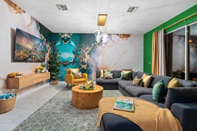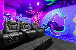 This family retreat features a Disney Villains movie theater with a 4K projector, reclining chairs, and Dolby 5.1 surround sound, and a Super Mario Bros game room with air hockey, ping pong, a Lego wall, and 2 Xbox 360 consoles. The fully equipped kitchen includes modern appliances, a microwave, toaster, blender, coffee machine, and all essentials. Enjoy the spacious living room with a plush sectional and 75" Smart TV, and a dining area that seats 8, plus 4 at the kitchen island. There are also in-unit washers and dryers, and central A/C and heating.
