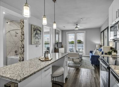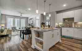 Designer Living Spaces: Each one- or two-bedroom home features sophisticated finishes, including herringbone tile backsplashes, sleek white European cabinetry, and elegant wood-style flooring. Modern conveniences like keyless smart locks, programmable thermostats, and in-home washers and dryers ensure a seamless daily routine.