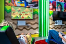 This family retreat features a Disney Villains movie theater with a 4K projector, reclining chairs, and Dolby 5.1 surround sound, and a Super Mario Bros game room with air hockey, ping pong, a Lego wall, and 2 Xbox 360 consoles. The fully equipped kitchen includes modern appliances, a microwave, toaster, blender, coffee machine, and all essentials. Enjoy the spacious living room with a plush sectional and 75" Smart TV, and a dining area that seats 8, plus 4 at the kitchen island. There are also in-unit washers and dryers, and central A/C and heating.