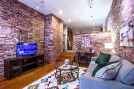This apartment features luxury finishes like stainless steel appliances, hardwood floors, exposed brick, reclaimed wood floors, a queen bed, and in-unit laundry.