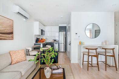 This fully furnished apartment includes a fully equipped functional kitchen, high-speed internet, a modern bathroom with a standing shower, a living area with a 50" TV, and a washer and dryer in unit.