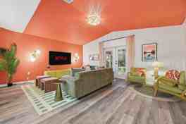 This home features ample living space, a fully equipped chef’s kitchen with high-end appliances and a coffee station with a Keurig, drip, and French press, and cozy communal areas. Enjoy the game room/home theater with a projector and white screen, popcorn machine, plush seating, sound system, arcade machines, foosball, shuffle board, and Pop-A-Shot. There is also an indoor bar area with bar essentials, a pool table, poker table, and plush seating. The outdoor area includes a heated pool with a built-in spa, fire pit, grill, sports court, putting green, cornhole, giant Jenga, giant Connect 4, al fresco dining, and an outdoor seating area.