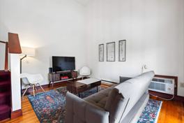 Enjoy the convenience of a fully equipped kitchen and a comfortable king-size bed. With its open-concept design and eighteen-foot ceilings, this furnished apartment provides a unique and unforgettable stay. It also features an office area and a Jacuzzi tub.