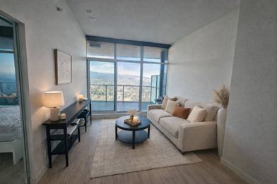 One bedroom penthouse condo at Brentwood Hillside East by Concord Pacific. 568 square feet of spacious indoor living plus over 200 square feet of covered and heated outdoor space. Unobstructed northeast view of Indian Arm, SFU, North Shore mountains, and more.