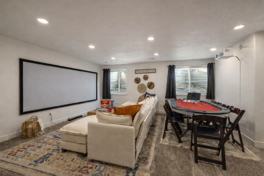 The main level features an open layout with a fully equipped kitchen, dining area, and comfortable living room. Downstairs, this home truly shines as an entertainment hub with a private theatre room, poker table, mini golf area, and additional sleeping space. Outside, unwind in the private backyard with a hot tub and fire pit.