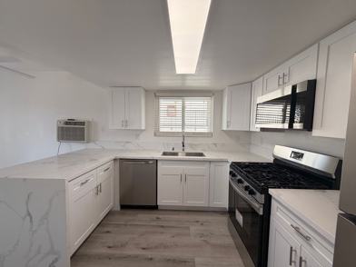 The unit showcases a renovated kitchen with shaker-style cabinets, quartz countertops, and brand-new stainless steel appliances, including a stove, refrigerator, dishwasher, and microwave. The bathroom has been thoughtfully upgraded with a new tub and modern fixtures, while wood-grain LVP flooring throughout the living areas adds a clean, contemporary feel.