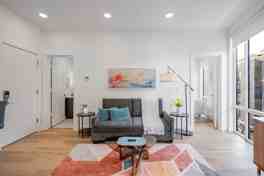 Building amenities include an elevator, a secure mailroom, keyless entry, and access to a spacious roof deck with BBQ. Professionally cleaned and disinfected between every stay. This apartment is fully furnished, featuring a kitchen equipped with pots, pans, glassware, and utensils.