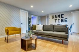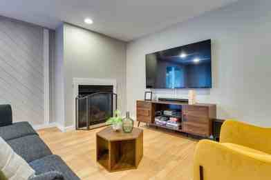 This upscale mountain getaway features a furnished deck with an outdoor dining table, a Blackstone grill, a patio heater, and a hot tub. Inside, you'll find smart TVs, including a 75" 4K TV with Roku, a dining table, a game room, arcade games, an Xbox One with games (Fibbage, Advanced Warfare, GTA, Star Wars, and Battlefront), and board and card games. The fully equipped modern kitchen includes stainless steel appliances, a farmhouse sink, a dishwasher, a microwave, a coffee maker, a blender, dishware and flatware, a breakfast bar with seating, and a breakfast nook. Other amenities include free Wi-Fi, a washer and dryer, laundry detergent, linens and towels, baseboard heating, complimentary toiletries, ceiling fans, and a hair dryer. A baby play and sleep pen is also available.