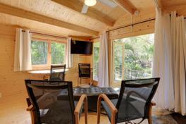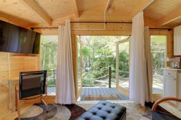 This studio features a private deck with a water view, a Smart TV with cable, and a ceiling fan. The kitchenette includes a mini fridge, hot plate, microwave, Keurig coffee maker with starter coffee provided, toaster, dishware and flatware, and cooking basics. Shared amenities include a dock for small boats and watercrafts, kayaks and life vests, and a spacious yard with a hammock. A full-sized refrigerator and freezer are available upon request. Towels, linens, trash bags, and paper towels are provided.