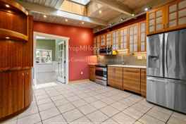 -Bright kitchen with rich cherry wood cabinetry and Asian-inspired design elements