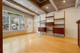 -Inviting entry with mid-century modern teak built-in shelving adding charm and character