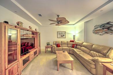 This 2,147 sq ft condo features a fully equipped kitchen, a family room with a large sectional sofa, and a screened lanai with a dining area. The kitchen includes a dishwasher, cooking basics, blender, toaster oven, toaster, coffee maker, knife set, dishware, and flatware. Additional features include 2 dining tables, 3 flat-screen TVs with cable, an en-suite bathroom, ceiling fans, a golf course view, an outdoor dining area, free Wi-Fi, central A/C, linens and towels, a washer and dryer, trash bags, and paper towels.