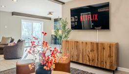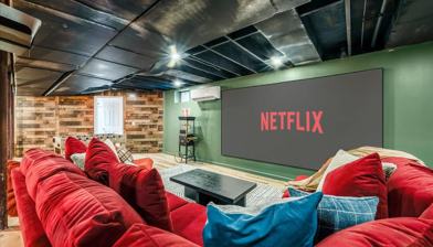 This expansive retreat is designed for large groups, family reunions, and friend getaways. It features 6 bedrooms, 4.5 bathrooms, a chef’s kitchen that is fully stocked with high-end appliances, a large refrigerator, ample cabinetry, a large island with high seating, a Keurig and drip coffee maker, and direct patio access. The living room includes a smart TV, a large plush sofa, an indoor fireplace with sitting area, and direct access to the patio. For entertainment, there is a home theater with plush seating and a popcorn machine, a pool table, ping pong, foosball, air hockey, shuffle board, darts, a gym, and a kid's room with arcade machines, Pop-A-Shot, indoor wall climbing, a rope net hammock, a ball pit, wall tic tac toe, kids chairs and table, and a chess set.