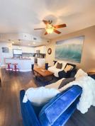 The kitchen is fully equipped for you to enjoy a home-cooked meal after a long day at the beach. The master bedroom has a king-size bed with a private en suite bathroom and a double sink vanity with upgraded granite countertops. The bunk area is located in the hallway and has its own bathroom. The open living room is spacious and perfectly set-up for everyone to gather and connect during vacation. Amenities include free Wi-Fi, heated pool, two outdoor hot tubs, tiki bar, fitness center with state-of-the-art equipment, in-unit washer and dryer, private balcony with ocean view, linens, towels, toiletries, and cable/satellite TV.