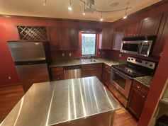 Modern Kitchen: Stainless steel refrigerator and stove, with ample counter space.