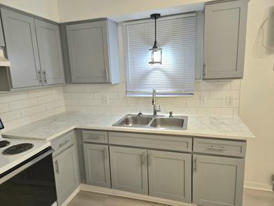 - Large kitchen with electric stove, stove hood and refrigerator