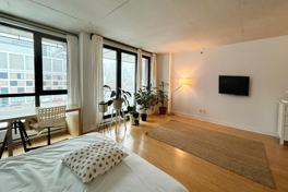 Bright open-concept loft at Lowney Phase 5 with downtown views and a modern quartz kitchen. Located in the heart of Griffintown, the building offers a gym, pool, spa, sauna, rooftop terraces, and secure access, all within walking distance to downtown and Old Montreal.