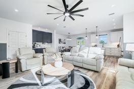 Perfect for families and groups, Oleander Breeze comfortably sleeps up to 14 guests and offers a bright, open layout paired with exceptional outdoor amenities. The interior is light, airy, and thoughtfully designed for comfort and connection, featuring an open-concept living area with comfortable seating, a faux fireplace, and board games. The large, well-equipped kitchen includes island seating for 4, a dining table seating up to 8, and a coffee and wine bar with a mini fridge and separate coffee maker. Step outside to your fully fenced private backyard, designed for relaxation and fun, with a private swimming pool (pool heating available during cooler months), hot tub, sun loungers and umbrella, fire pit with seating, propane gas grill, and corn hole games.
