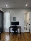 Apartment has high ceilings, large walk-in shower, and is furnished with a queen bed, large desk and monitor, clothes rack, and small dresser.
