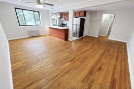 The living area offers generous square footage with rich, warm-toned hardwood floors and large windows that fill the space with natural light. The updated kitchen includes stainless steel appliances, modern cabinetry, sleek countertops, and stylish pendant lighting over a breakfast bar—perfect for entertaining or casual dining.
