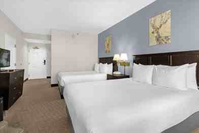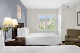 This 542 sq. ft. suite features two queen-size beds with quality linens, comfy pillows, and comforters. It includes a bathroom with a bathtub/shower combo, a mini fridge, a coffee maker, a TV with complimentary cable, high-speed internet, and central air conditioning. Guests have full access to building amenities, including a communal outdoor pool, a communal outdoor hot tub, a spacious furnished patio, poolside loungers, a communal BBQ and outdoor dining area, a fitness center, an onsite restaurant and bar, an arcade room, a basketball court, and a 24/7 laundry room.