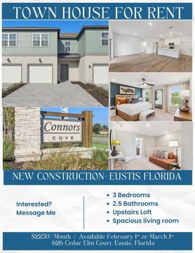 MOVE IN READY! Just minutes from charming Downtown Eustis and the vibrant shops and dining of Mount Dora, this stunning townhome offers an amazing location and incredible pricing! With over 1,600 sq. ft. of thoughtfully designed living space, this home includes 3 bedrooms, 2.5 bathrooms, and a spacious loft ideal for work or relaxation. Step inside from the large covered porch and enjoy an airy, open-concept layout enhanced by white cabinetry throughout, sleek vinyl flooring on the first floor, and impressive 9'4" ceilings. The modern kitchen showcases stainless steel appliances and flows seamlessly into the great room and dining area—perfect for entertaining. Sliding glass doors open to a generous covered lanai, extending your living space outdoors. Upstairs, the primary suite features a private bath and walk-in closet, while two secondary bedrooms share a full bath. With a 1-car garage and 2-car driveway, and HOA-covered lawn maintenance, this beautifully crafted townhome delivers effortless, low-maintenance living in a truly exceptional setting. And best of all, you’re moments away from amazing local attractions: explore the boutiques, cafés, and festivals of Mount Dora- enjoy waterfront dining and scenic boat tours on Lake Dora- or spend the day in Eustis strolling Ferran Park, catching a show at the historic Bay Street Theater, kayaking on Lake Eustis, discovering wildlife at Trout Lake Nature Center, or browsing the shops and restaurants in Downtown Eustis. With so many things to see and do, you’ll love calling this location home.!