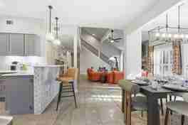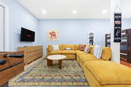 This home features bright, open living spaces ideal for gathering, a fully stocked chef’s kitchen with high-end stainless appliances, ample cabinetry, a large island with high seating, and a coffee maker with drip, Keurig, and French press options. Enjoy the 65" Smart TV, large plush sofa and seating, and expansive windows in the living room. For entertainment, there's a bunk/game room with arcade games, basketball hoops, and a foosball table, plus a kid’s playroom with wall climbing, a foam pit, a play tent, and board and card games. Additional amenities include an outdoor patio/dining area, a built-in BBQ grill, poolside loungers with umbrellas, a washer and dryer, and ample parking.