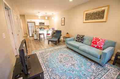 This fully furnished apartment features a fully stocked kitchen with new stainless steel appliances and quartz countertops, ideal for long-term stays. The living room offers an open concept with plenty of seating for entertainment, a TV, fast and reliable internet, and a washer/dryer. The bedroom includes a queen-size bed, ample storage space with closets and a dresser, and a large window with lots of natural light. The bathroom features a shower and tub.