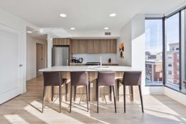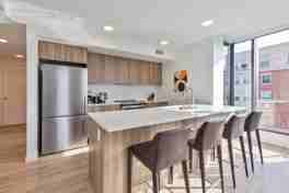 This sleek space features stainless steel appliances, quartz countertops, ample soft-close cabinetry, floor-to-ceiling windows, an expansive kitchen island, and a sleek, modern bathroom complete with an LED mirror. Select units boast floor-to-ceiling bay windows and private balconies. Residents can enjoy access to a fitness center, yoga studio, pet spa, café with fresh cold brew, chic co-working spaces, private dining areas, lush courtyards, and rooftop terraces equipped with gas grills, an outdoor projector, and a cozy lounge.