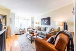 The home features a fully equipped modern kitchen, a dining space for six, and a luxurious living room with cozy seating and views of the St. John's Harbour. A washer and dryer are available.