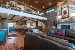 The heart of the home is the primary living room, anchored by a massive rock fireplace. Cozy couches, rich leather textures, and warm Western finishes create an inviting space. The upstairs loft is the perfect evening escape. The Western-style game and bar room delivers true lodge character with a custom-built bar, rustic slate pool table, card table, and additional smart TV. The expansive east-facing patio is designed for every moment of the day with a covered hot tub, multiple seating zones, covered outdoor dining, and propane BBQ.