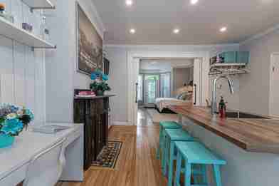 This apartment features a loft-like master bedroom, an en-suite stand-up shower, a fully equipped kitchen, coffee, a TV with cable, and an in-unit washer and dryer. Enjoy fast Wi-Fi and professional cleaning services.