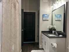 This upscale apartment in North Charleston boasts a gourmet kitchen with premium appliances and granite countertops, a full-capacity in-suite washer and dryer, and a spacious bathroom with a walk-in closet.