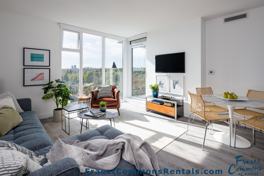Enjoy air-conditioned comfort in this spacious 2-bedroom, 2-bathroom home located on the 6th floor. The open-concept layout offers a bright and inviting atmosphere with beautiful views and plenty of natural daylight from floor-to-ceiling windows. The primary bedroom includes a walk-in closet for added storage and convenience. The kitchen features premium Bosch appliances (gas range and fridge), quartz countertops, Italian soft-close cabinetry with under-cabinet lighting, and a marble-inspired backsplash. The bathroom includes a modern floating vanity and elegant finishes for added style and function.
