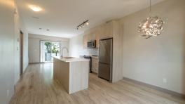 Quiet and secure townhouse unit accessed through a large feature garden with FOB security control. This 2-bedroom upper level home offers a contemporary styled kitchen, featuring stainless appliances, double sinks, and gorgeous modern Formica cabinetry. Floor plans have been designed to utilize the interior space, giving a spacious feeling, with over-height ceilings and sleek interior styling.
