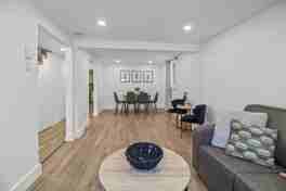 The spacious living area has a large sectional couch, a smart TV, and an adjacent dining room fully decorated with modern furniture and seating for six guests. The statement green kitchen is equipped with everything you need to make a family meal, complete with a dishwasher, toaster, kettle, coffee maker, and oven. There is also a half bath and laundry on the main floor.