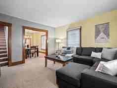 This home is complete with a fully equipped kitchen featuring plenty of counter space and a dedicated coffee bar with coffee, creamers, syrups, and sugar. The cozy living room has a sectional and Smart TV. The dining room sits 6 comfortably. Additional amenities include an inviting front porch with outdoor seating and a basement laundry with a washer and dryer for your convenience.