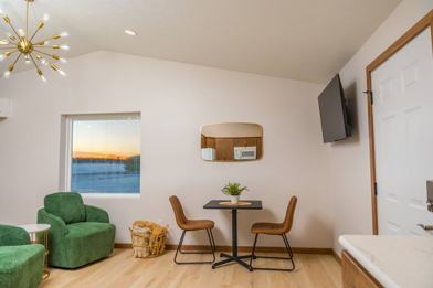 Sunset light fills the space through a large picture window. The apartment features a fully equipped kitchen, a dining table, a washer and dryer, heating and air conditioning, and Wi-Fi. The sleeping area includes a queen-size bed, and the open living space offers a TV for streaming your favorite shows.