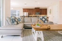 This spacious villa features a private screened pool, a fully equipped game room, and open living areas designed for comfort and fun. The villa boasts modern décor, Smart TVs in every bedroom, and a fully equipped kitchen with stainless steel appliances, Keurig and drip coffee makers, cookware, utensils, and dinnerware. There is a bright and spacious living area with a plush sectional sofa and a large Smart TV. The family room, a second lounge space near the kitchen, has a cozy sectional sofa and a Smart TV. The laundry room includes a washer, dryer, iron, ironing board and starter detergent kit.