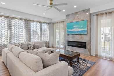 Every detail has been thoughtfully curated to inspire and impress. The first-floor living space welcomes you with keyless entry, a large TV, a queen sleeper sofa, a kitchenette with a mini fridge, and a foosball table. Bedroom 1 features two triple twin bunk beds, a walk-in closet, a full-sized washer and dryer, and an en-suite bathroom with a stand-up shower. The second floor features a dining space with seating for 10, a private balcony, and a kitchen equipped with modern appliances and a wine cooler. The living area features a large Smart TV and a cozy fireplace. Bedroom 2 offers a king-size retreat with a custom headboard, reading chairs, a large TV, and a walk-in closet. The en-suite bathroom includes a walk-in shower and dual vanities. Bedroom 3 offers a queen bed and shares a Jack-and-Jill bathroom. The third-floor living space features a kitchenette with a mini-fridge, a couch, and a large TV. Bedroom 4 offers a king-size bed and a spa-like en-suite bathroom with his-and-hers sinks and an oversized bathtub. Bedroom 5 has a king-size bed, a large TV, and private balcony access.