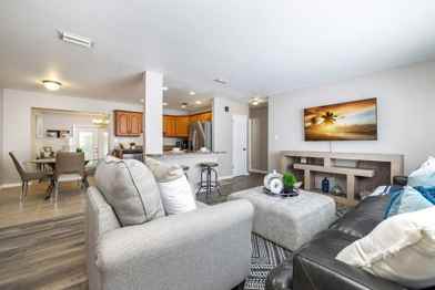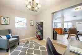 The house boasts three bedrooms and two bathrooms, a huge couch in the living area, and a king bed in the master bedroom. The fully equipped kitchen includes updated appliances, a dishwasher, and a coffee maker. Remote workers will appreciate the dedicated workspace with a desk and high-speed Wi-Fi. Relax in the living area with a smart TV and room-darkening shades for added comfort.