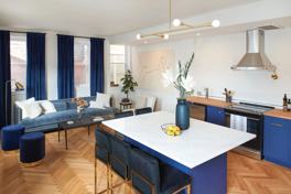 Inside, The Carriage House is your personal oasis from the action. The bedroom has a king-size bed as well as a day bed perfect for lounging under the dramatic skylight. The living room couch is comfortable and large, and an air mattress can be provided for additional guests upon request. The bathroom has a private water closet, glamorous clawfoot tub, and separate oversized shower. The kitchen includes a full oven and range, microwave, coffee-maker, dishwasher, TV, and bar-height seating for five. The perfect space for mingling, the kitchen and living room share one large space with herringbone wood floors, high ceilings, and lots of natural light.