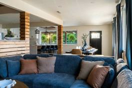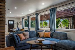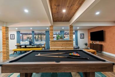 This home features a chef’s kitchen that is fully stocked with high-end stainless appliances and ample cabinetry. Relax in the living room with its 75” smart TV, large plush sofa, and expansive windows. For outdoor fun, enjoy the heated private saltwater pool, hot tub, outdoor patio with a TV, firepit, BBQ grill, corn hole, giant Connect 4, poolside loungers, umbrellas, a hammock, and a swinging daybed.