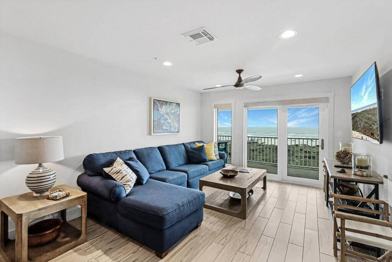 This apartment features a spacious open floor plan, a fully stocked kitchen with high-end stainless appliances, ample cabinetry, a large refrigerator, and a drip and Keurig coffee maker. The living room offers ample plush seating, a TV, a Bluetooth speaker, and direct balcony access with an ocean view. Enjoy the convenience of a washer and dryer, board and card games like Connect 4, Monopoly, and Scrabble, a beach wagon, and beach toys.